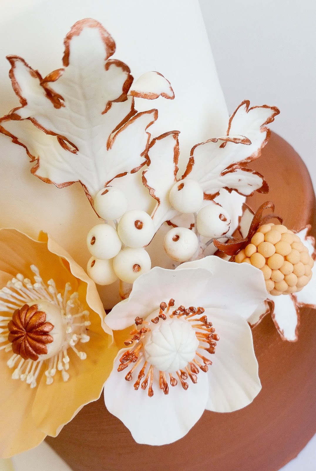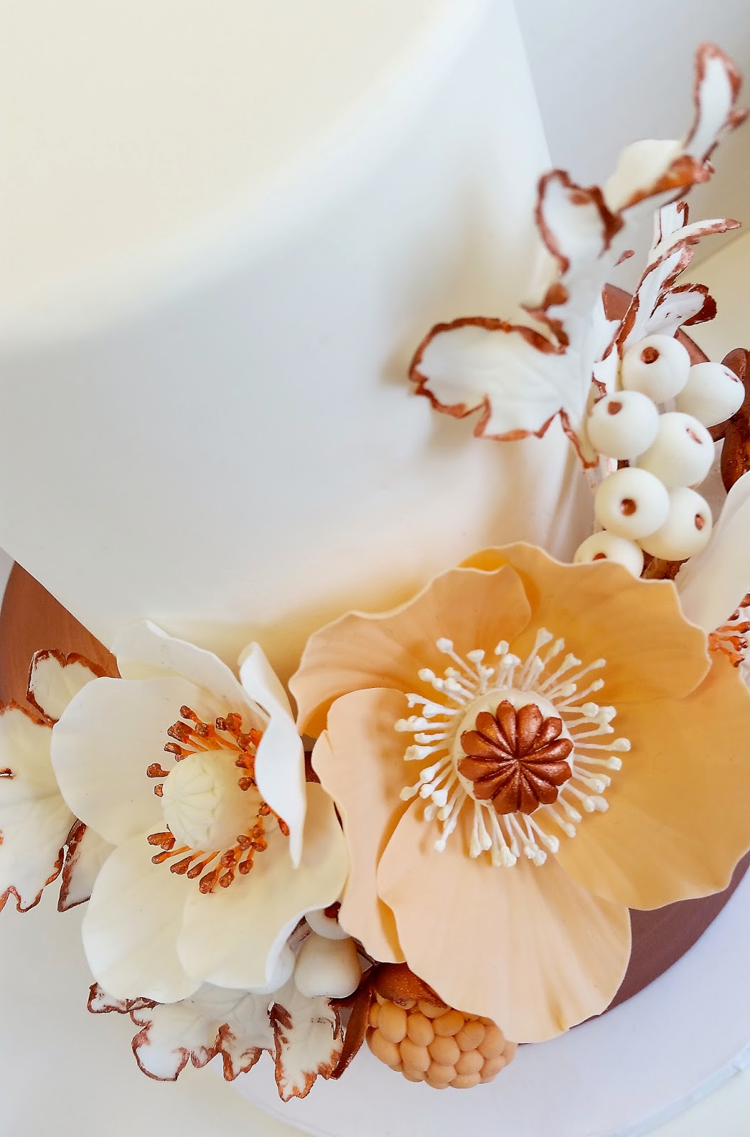 First up a small but striking cake. The bottom tier is brushed with a metallic copper petal dust and is adorned with gum paste poppies, leaves, and berries in peach and copper hues. The top tier is left blank to showcase the detailed arrangement.