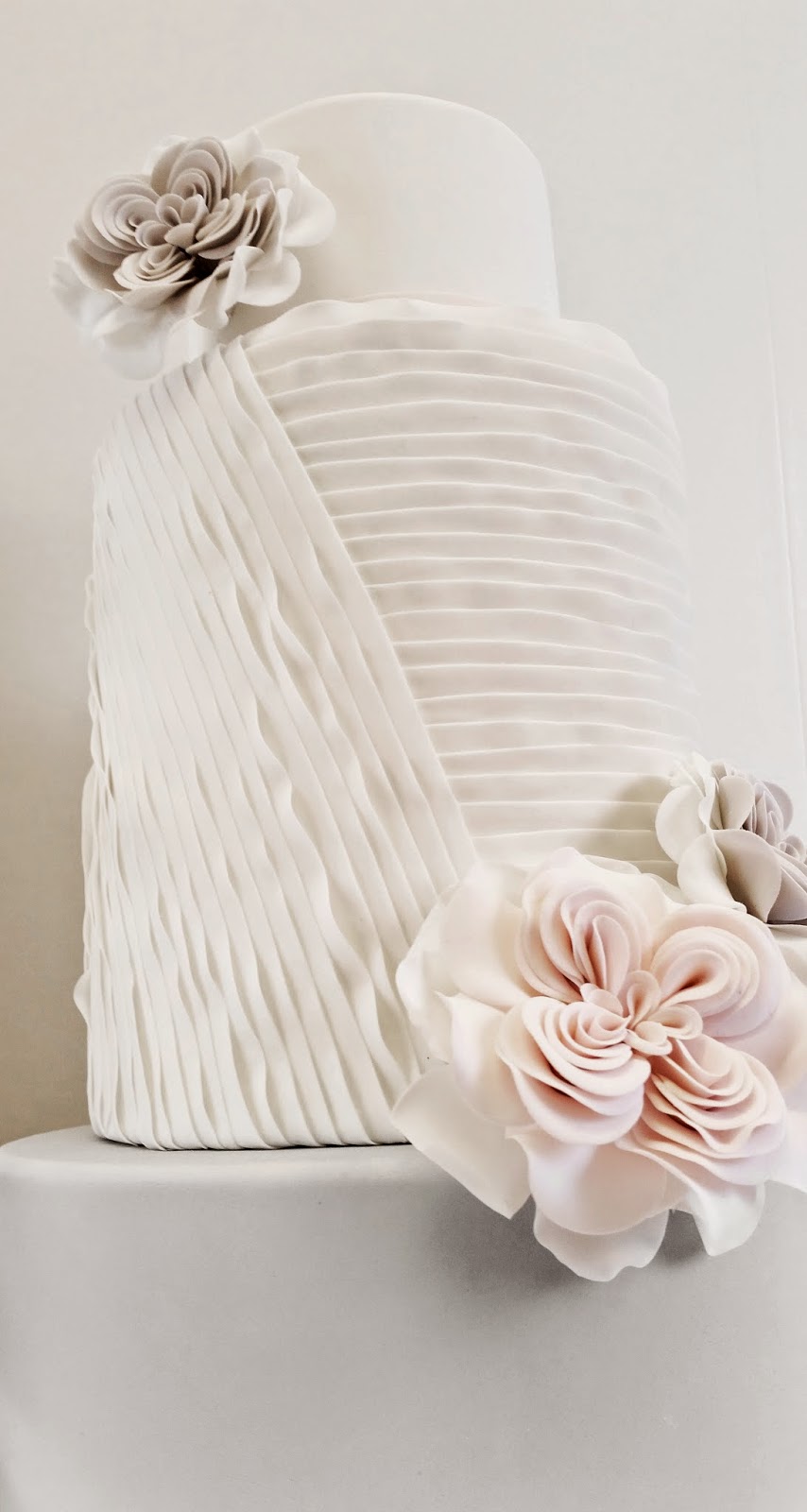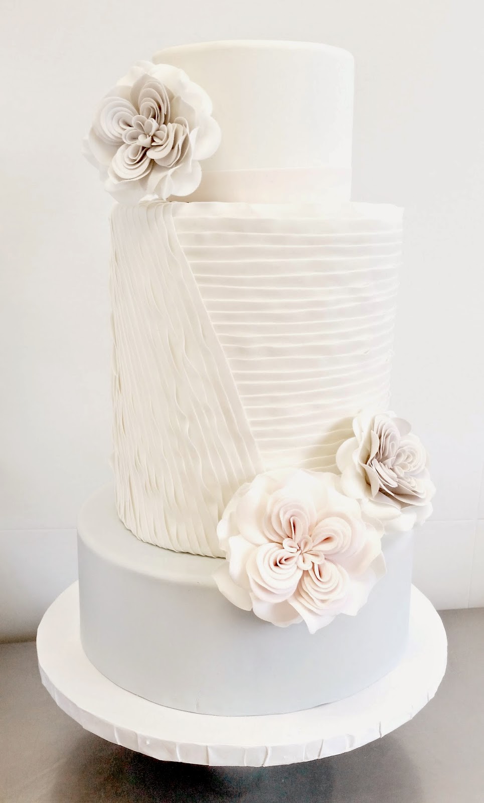 For now though, let's just talk about this cake. I've done ruffles, in fondant and buttercream, I've done them vertically and horizontally, and I've done them in ombre tones, and pretty pastels. I wanted to try them in a way that I'd never done before. Something a little more refined and clean. Soft and romantic, but clean and modern all at the same time, these ruffles are just a bit different than the typical ruffled wedding cake. Paired with soft pinks and grays, and stylized Juliet roses, this cake can make a statement without being over the top.